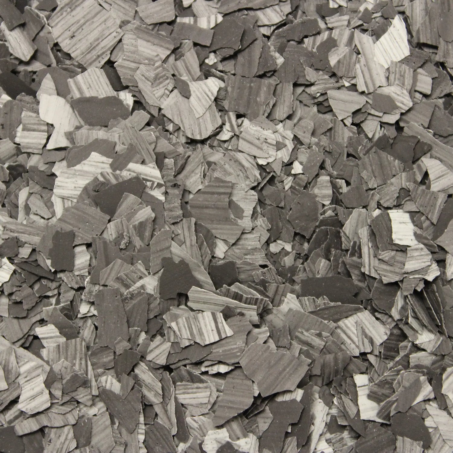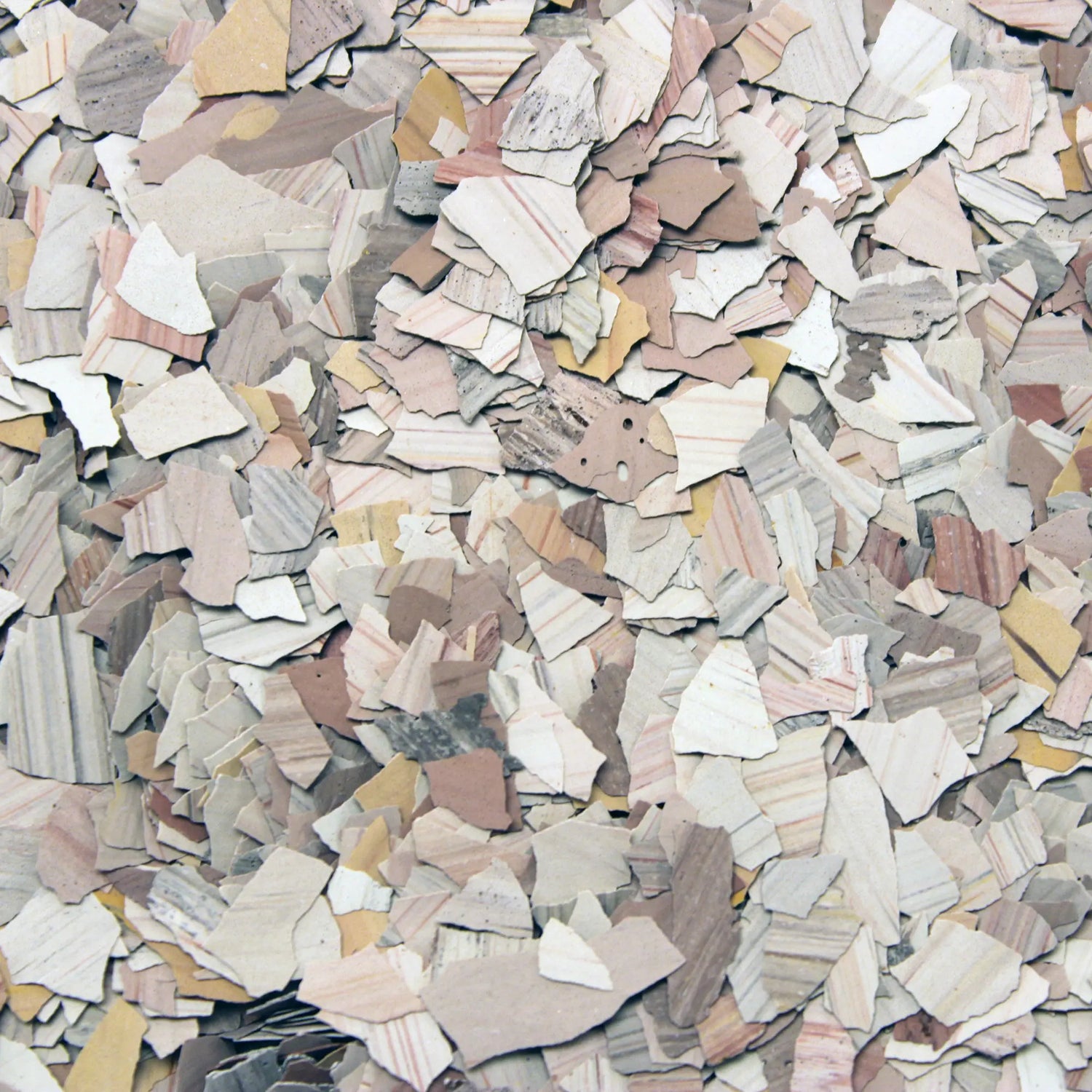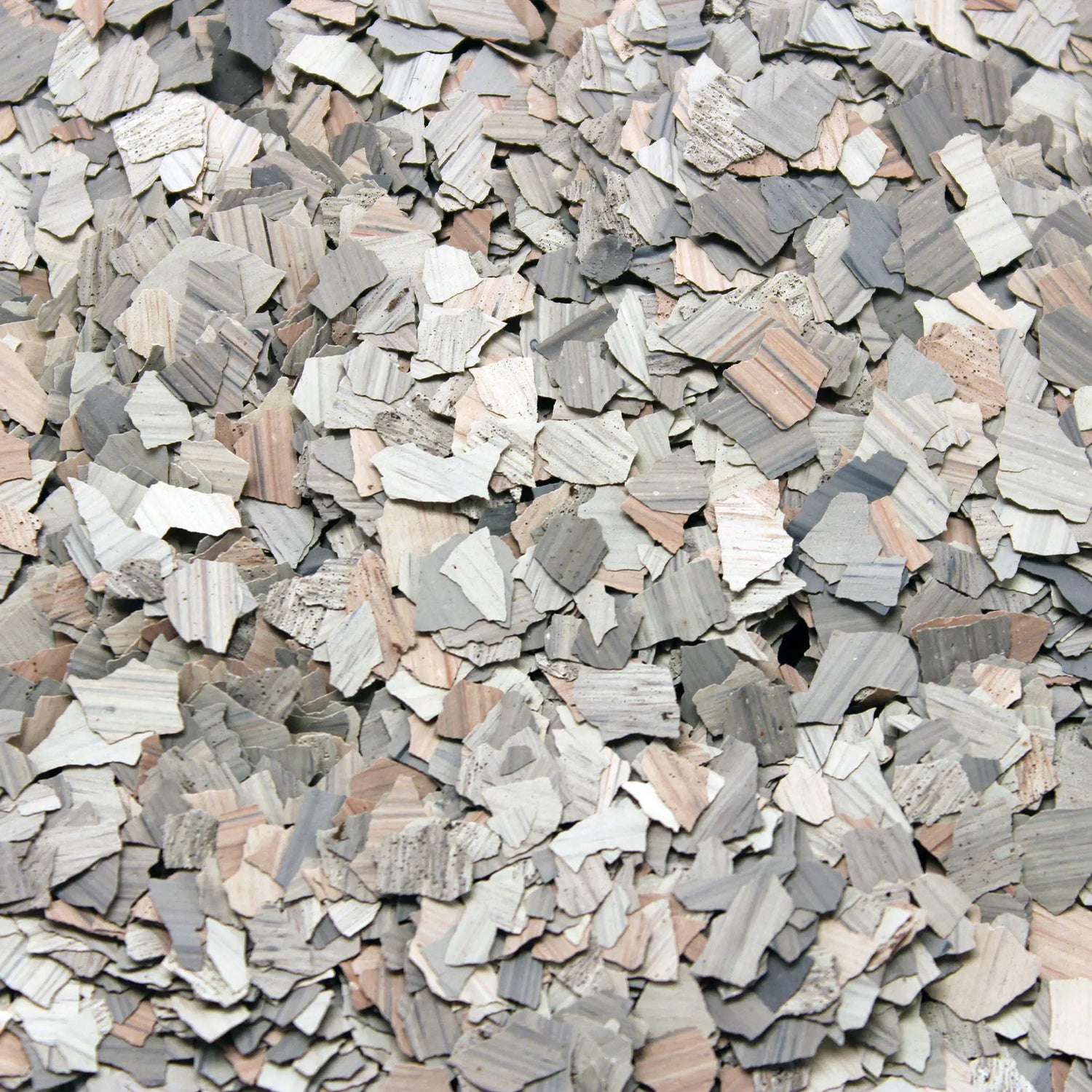 The blends are colorfast and UV stable, non-flammable, and random in shape for a consistent, natural appearance across the full broadcast. Because each blend combines multiple flake sizes, they provide strong hide of pitting, cracks, and surface irregularities while maintaining the visual texture that makes stone floors distinctive.